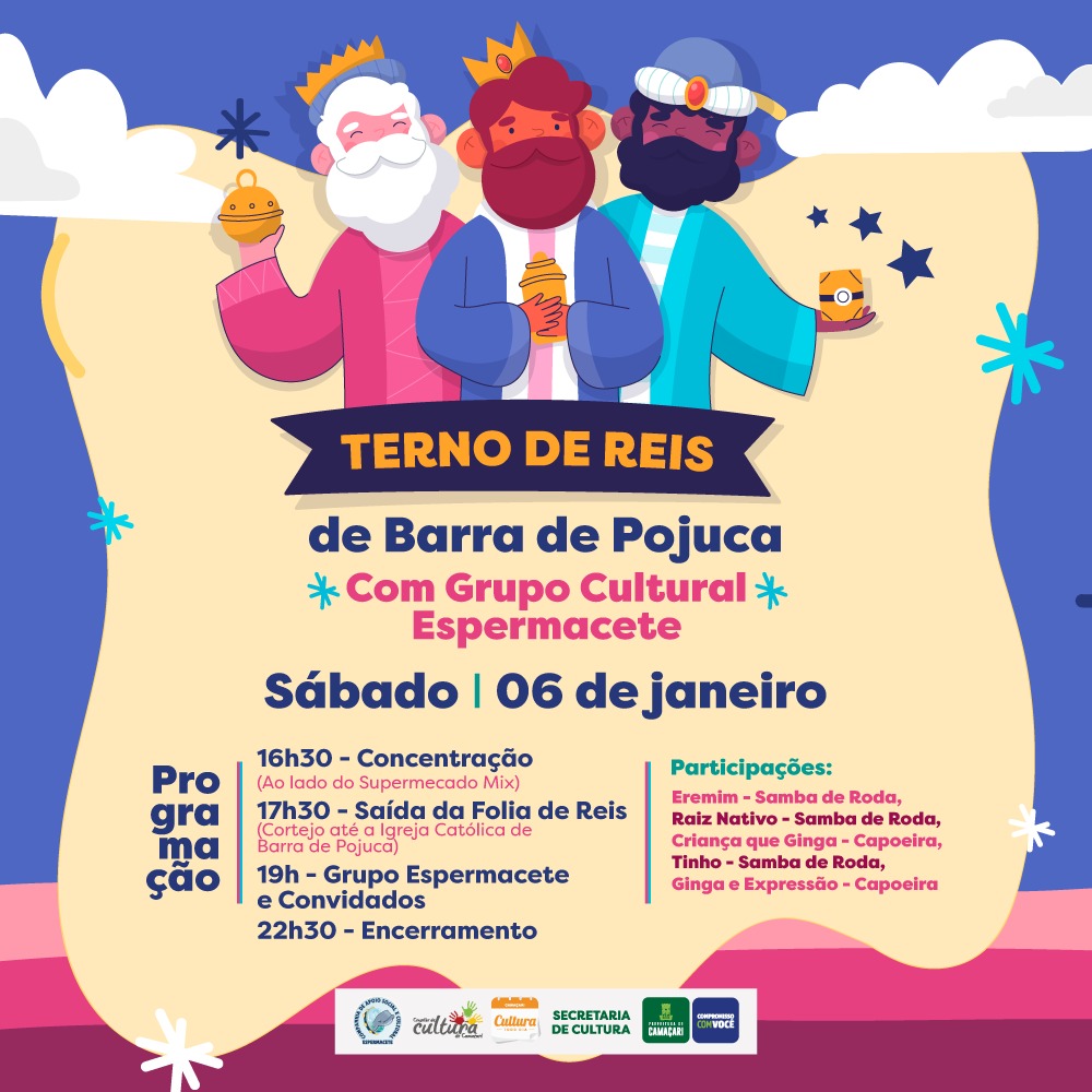 Abrindo o ciclo de festejos populares de Camaçari em 2024, a localidade de Barra do Pojuca, na costa do município, recebe no dia 6 de janeiro (sábado) a tradicional celebração ao dia de Terno de Reis promovida pelo Grupo Cultural Espermacete. O evento acontece em alusão à visita dos Três Reis Magos ao Menino Jesus.