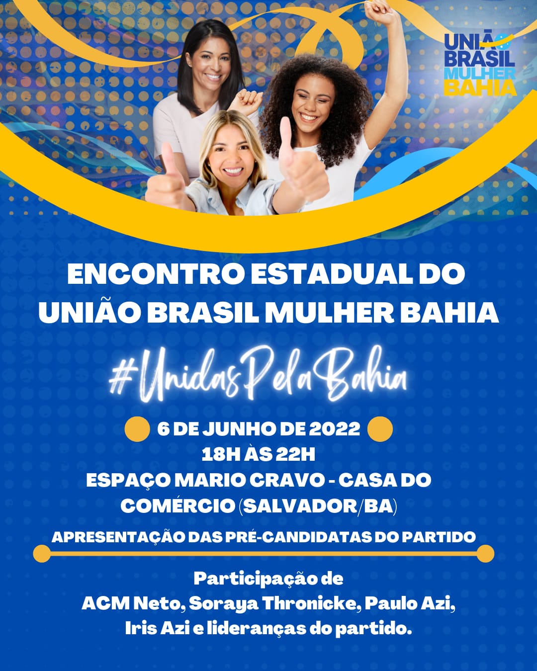 O evento terá a participação de ACM Neto, pré-candidato do União Brasil ao Governo da Bahia; Soraya Thronicke, presidente nacional do União Brasil Mulher; Paulo Azi, presidente do União Brasil Bahia; Iris Azi, presidente do União Brasil Mulher Bahia, e diversas lideranças políticas.