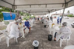 Vila de Abrantes recebeu nesta segunda-feira (1/6) uma ação de enfrentamento ao coronavírus da Prefeitura de Camaçari, realizada na praça da Matriz da localidade. Durante a iniciativa foram feitos testes rápidos, ações de controle do Aedes Aegypti, distribuição de cestas básicas, desinfecção e higienização de ambientes públicos e fiscalização.